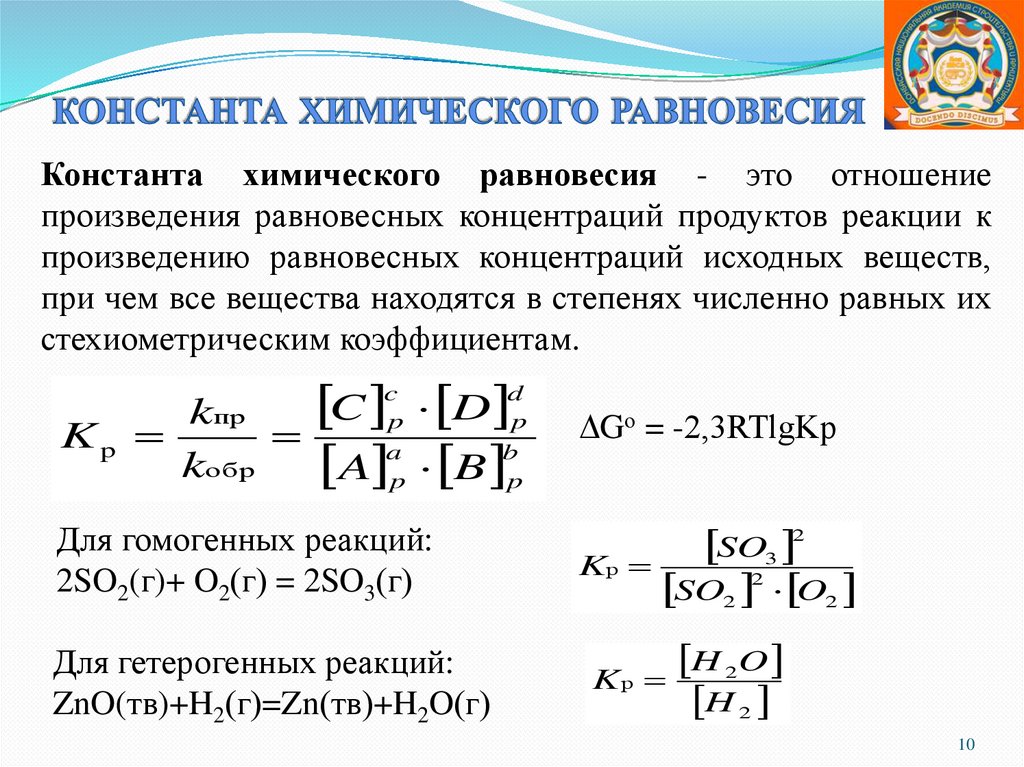 Константа химического равновесия - это отношениепроизведения равновесных концентраций продуктов реакции к