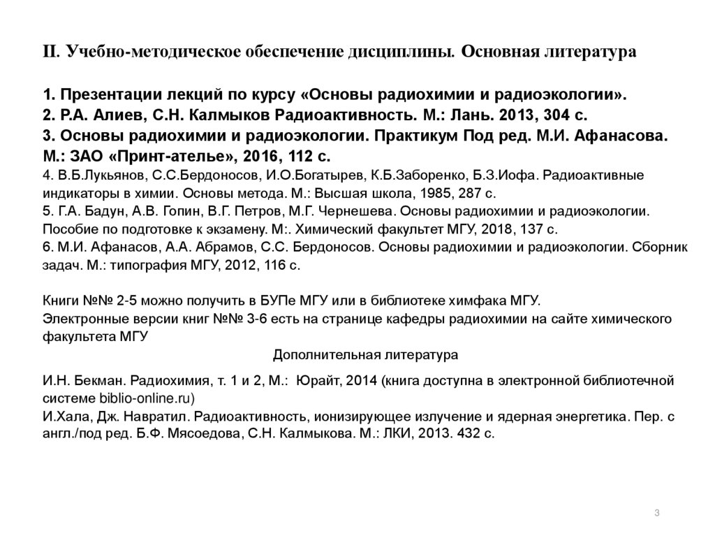 II. Учебно-методическое обеспечение дисциплины. Основная литература1. Презентации лекций по курсу «Основы радиохимии и радиоэкологии».