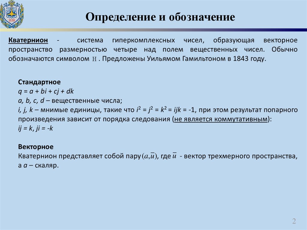 Определение и обозначениеКватернион система гиперкомплексных чисел, образующая векторное