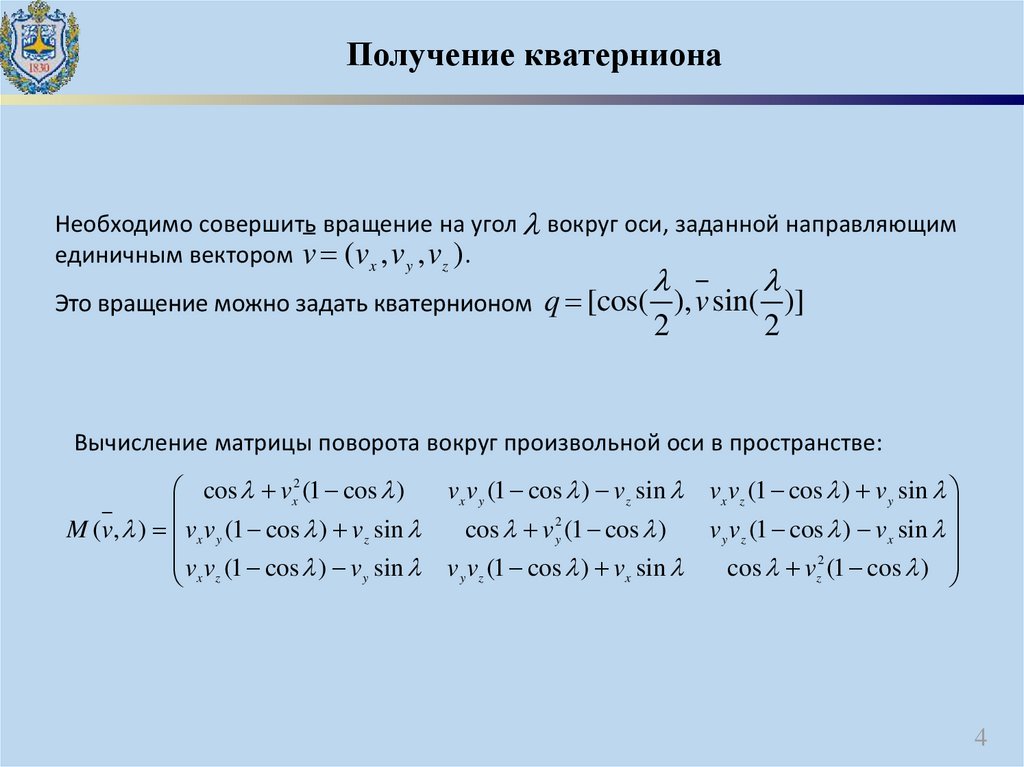 Получение кватернионаНеобходимо совершить вращение на угол вокруг оси, заданной направляющим