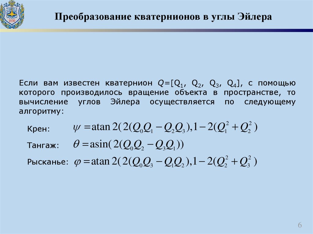 Преобразование кватернионов в углы ЭйлераЕсли вам известен кватернион Q=[Q1, Q2, Q3, Q4], с помощью