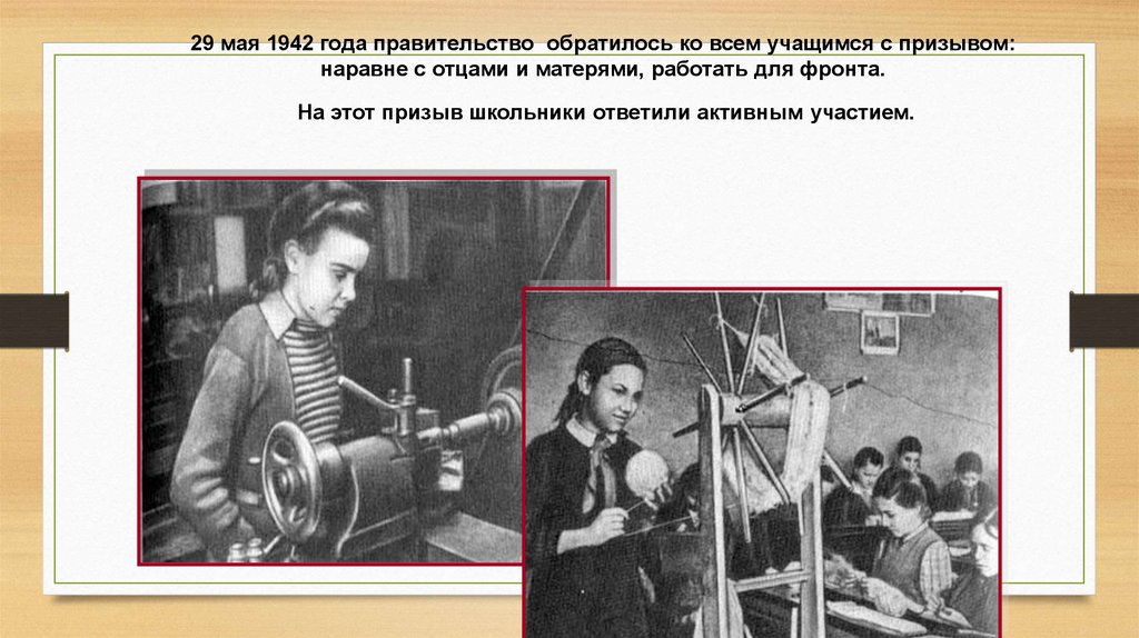 29 мая 1942 года правительство обратилось ко всем учащимся с призывом:наравне с отцами и матерями, работать для фронта.
