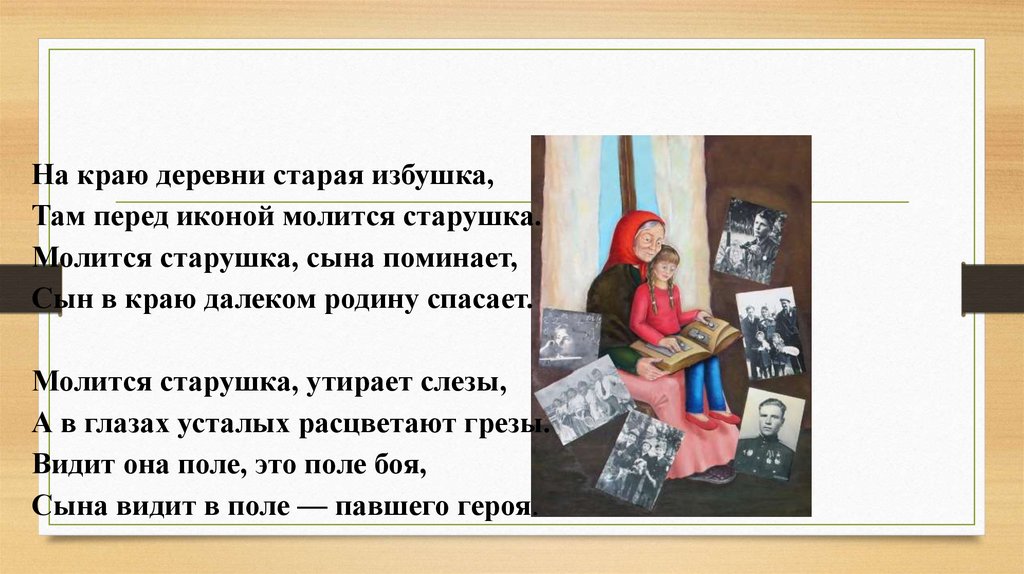 На краю деревни старая избушка,Там перед иконой молится старушка.