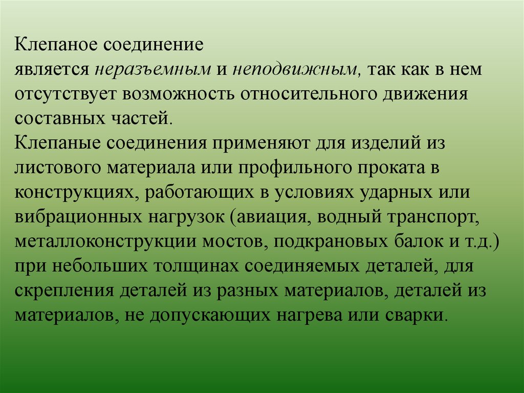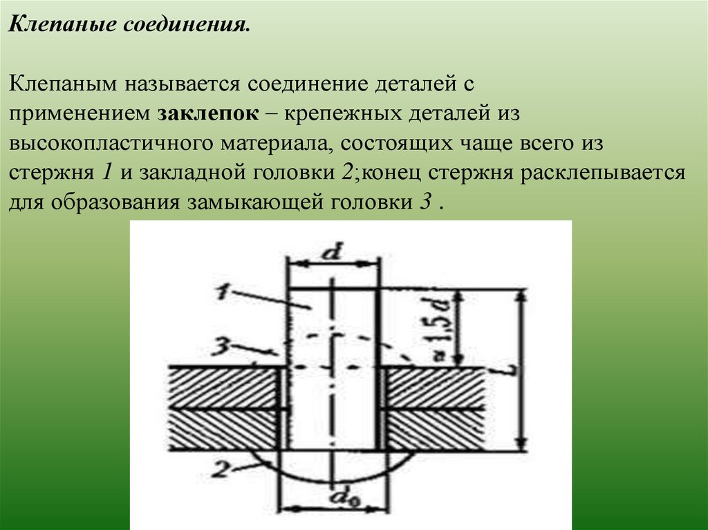 Клепаное соединениеявляется неразъемным и неподвижным, так как в нем