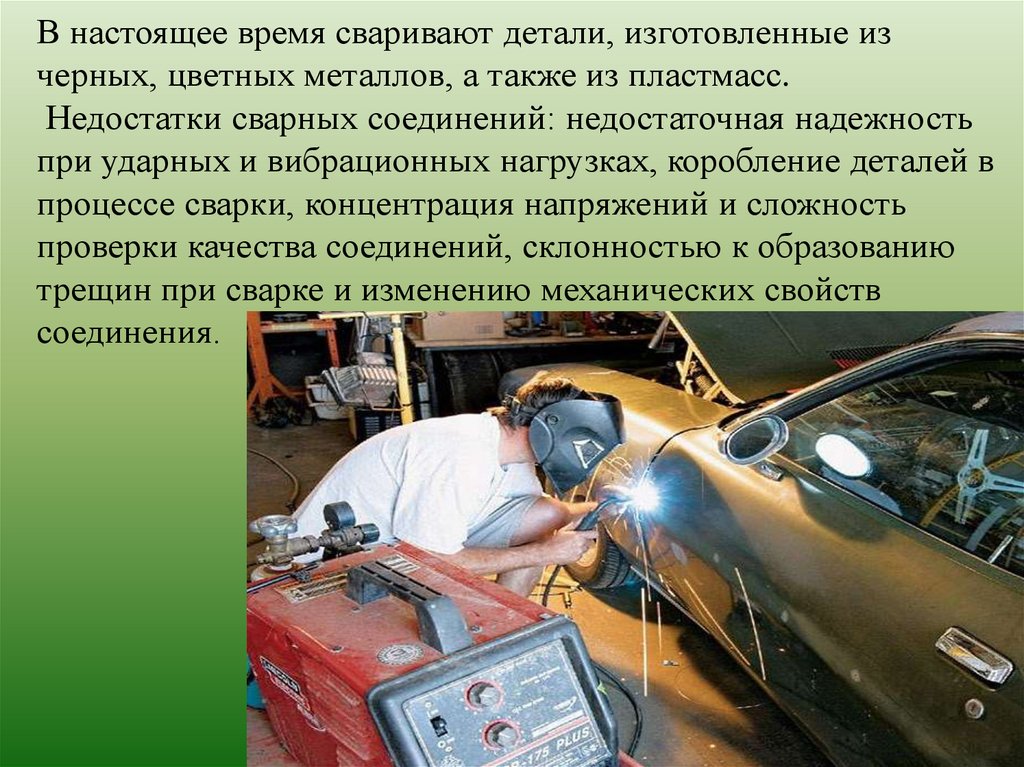 В настоящее время сваривают детали, изготовленные изчерных, цветных металлов, а также из пластмасс.