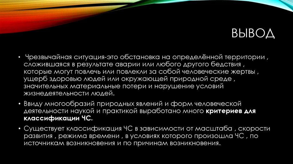 ВЫВОД• Чрезвычайная ситуация-это обстановка на определённой территории ,
