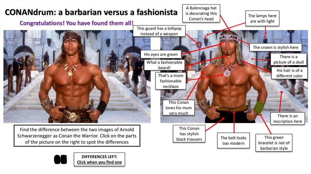 CONANdrum: a barbarian versus a fashionistaCongratulations! You have found them all!
