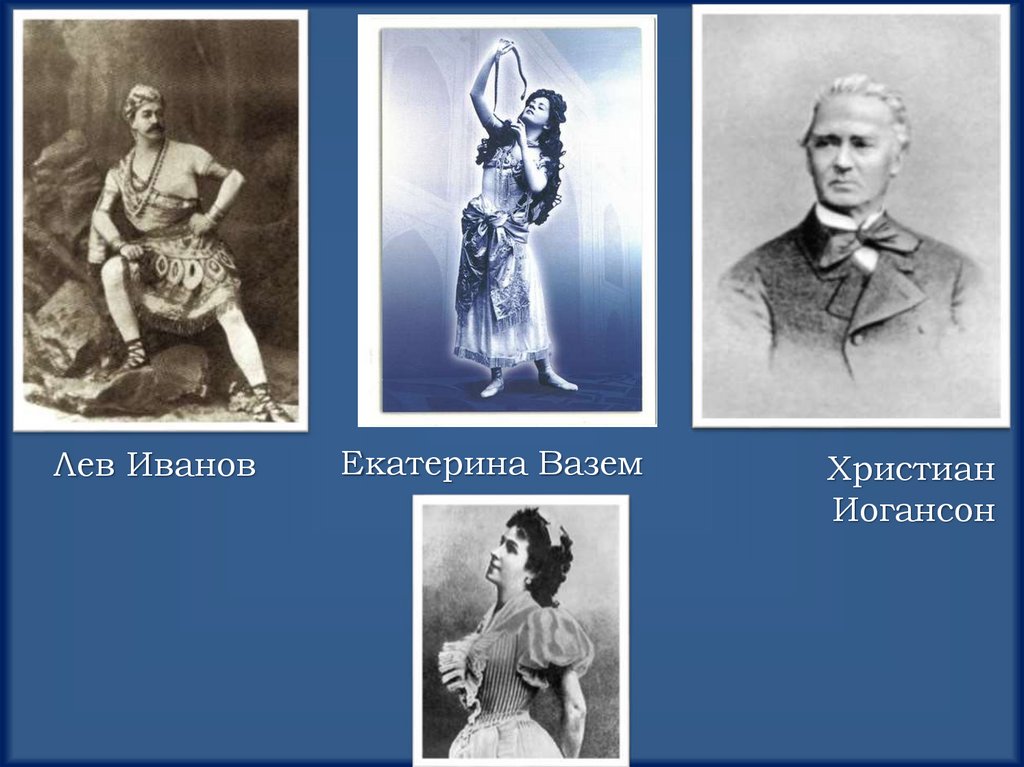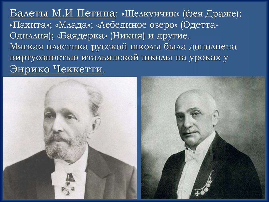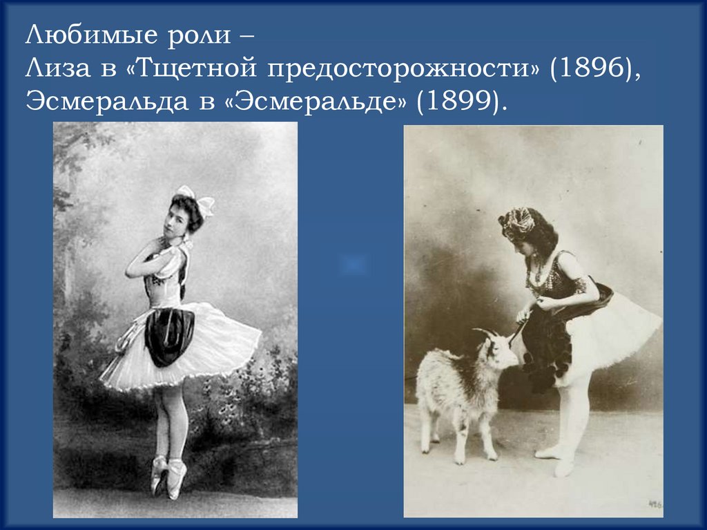 Балеты М.И Петипа: «Щелкунчик» (фея Драже);«Пахита»; «Млада»; «Лебединое озеро» (ОдеттаОдиллия); «Баядерка» (Никия) и другие.