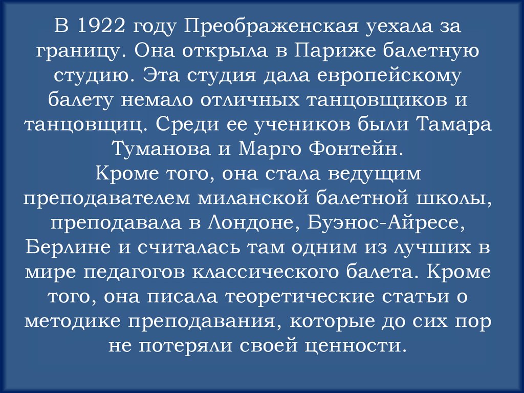 В 1922 году Преображенская уехала заграницу. Она открыла в Париже балетную