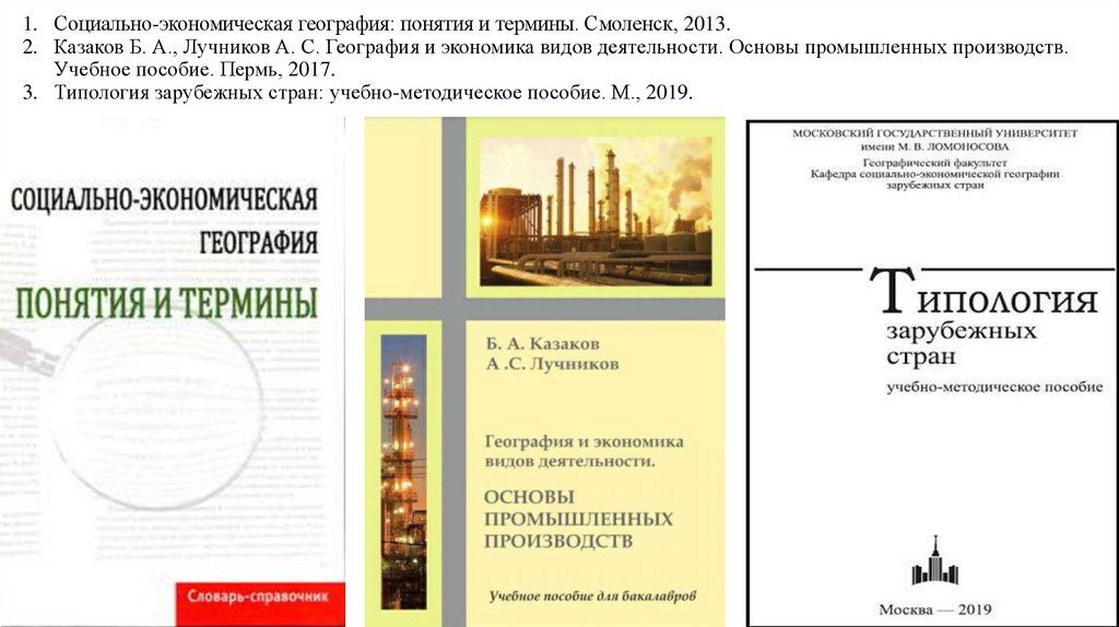1. Социально-экономическая география: понятия и термины. Смоленск, 2013.2. Казаков Б. А., Лучников А. С. География и экономика видов деятельности. Основы промышленных производств.
