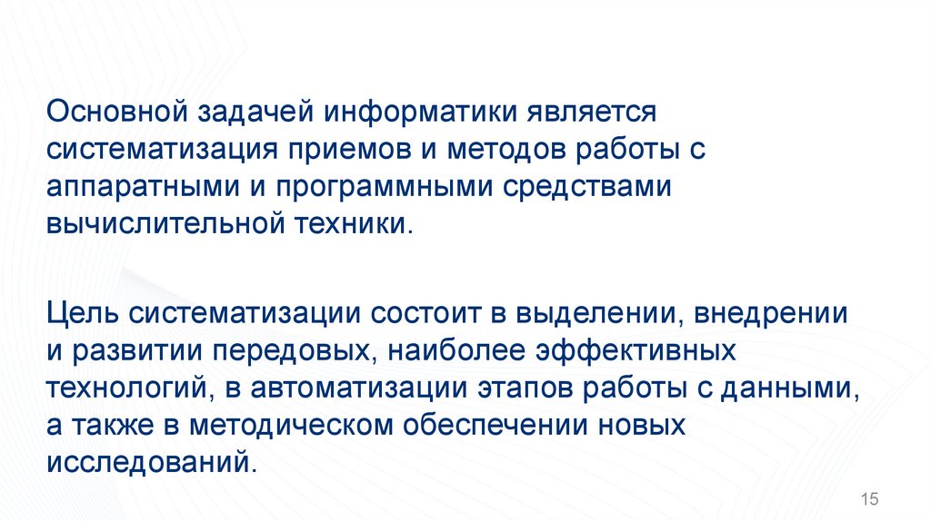 Основной задачей информатики являетсясистематизация приемов и методов работы с