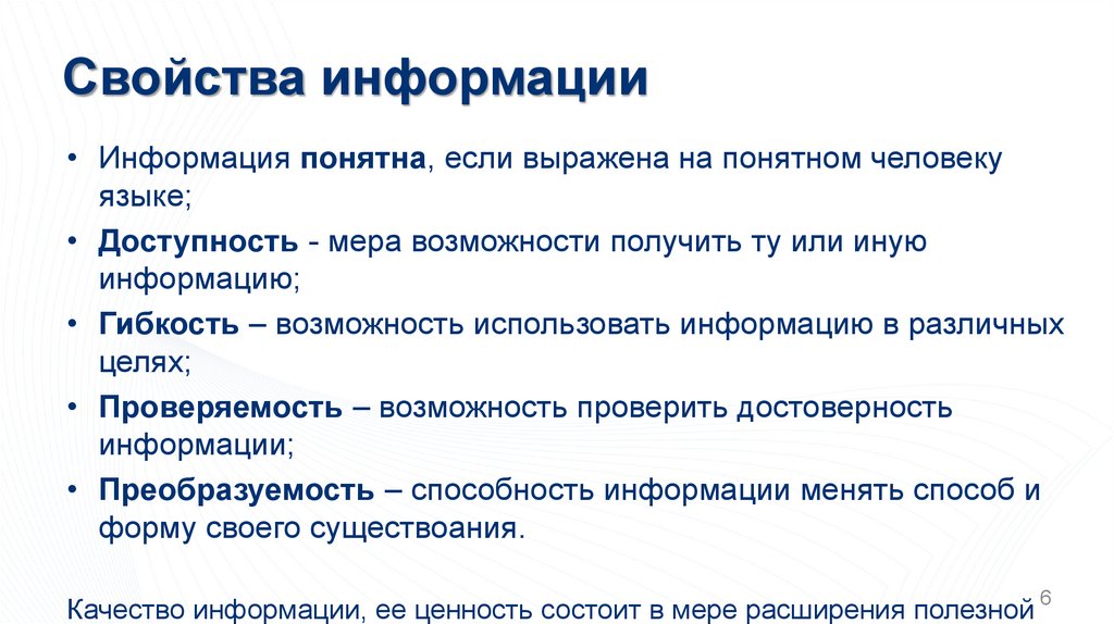 • Преобразуемость – способность информации менять способ и