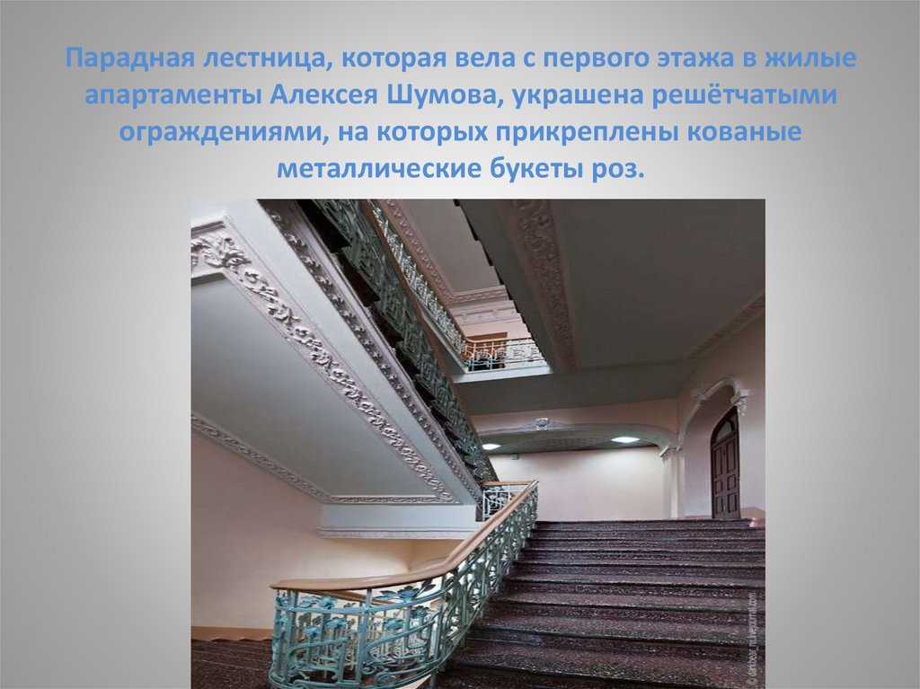 Парадная лестница, которая вела с первого этажа в жилыеапартаменты Алексея Шумова, украшена решётчатыми