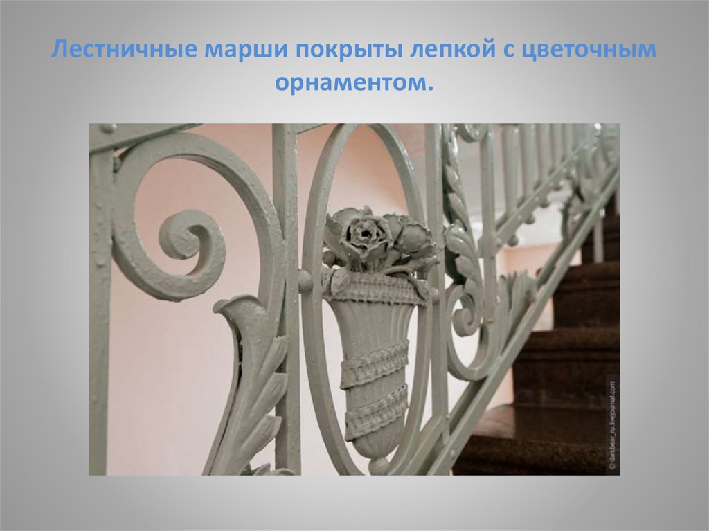 Лестничные марши покрыты лепкой с цветочныморнаментом.