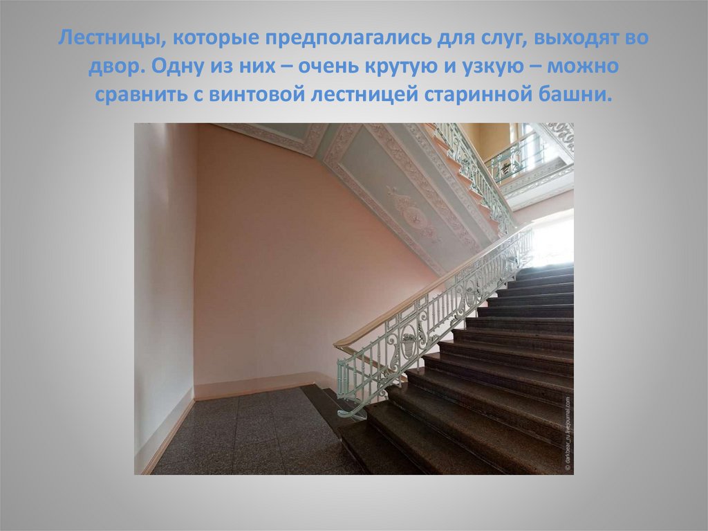 Лестницы, которые предполагались для слуг, выходят водвор. Одну из них – очень крутую и узкую – можно