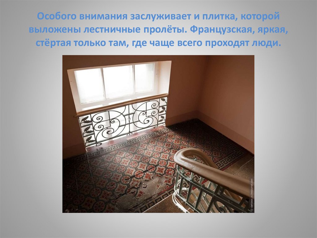 Особого внимания заслуживает и плитка, которойвыложены лестничные пролёты. Французская, яркая,