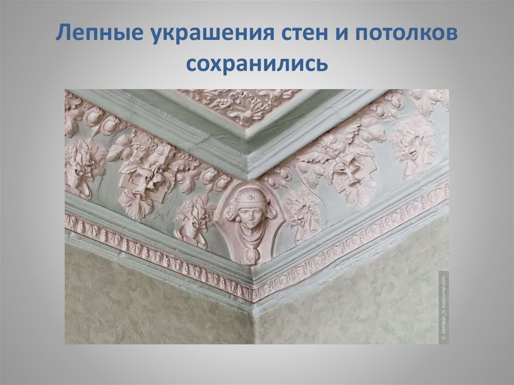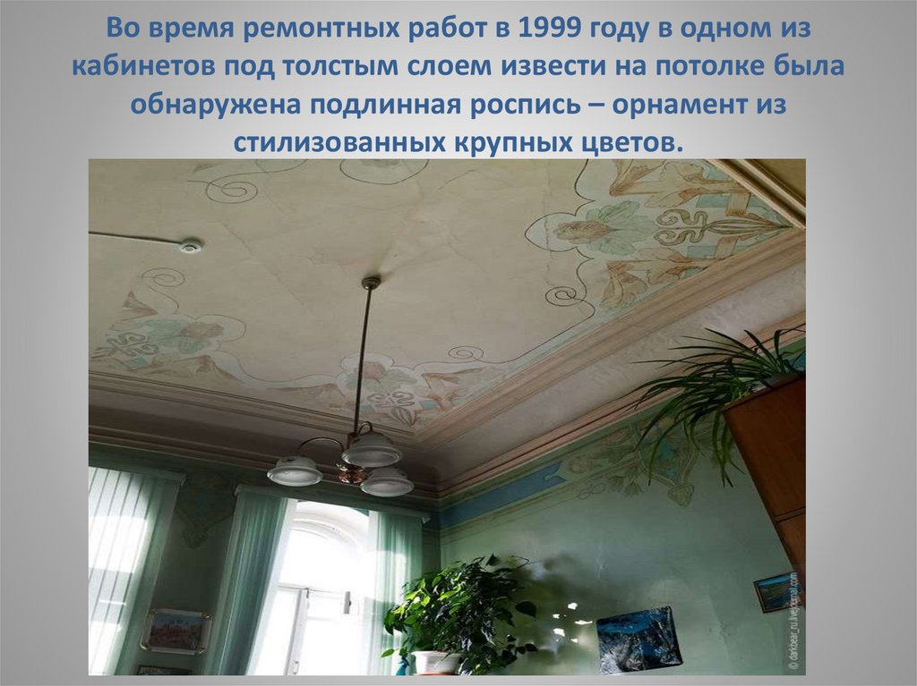 Во время ремонтных работ в 1999 году в одном изкабинетов под толстым слоем извести на потолке была