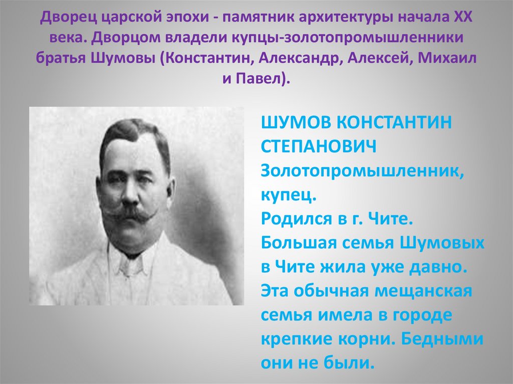 Дворец царской эпохи - памятник архитектуры начала XXвека. Дворцом владели купцы-золотопромышленники
