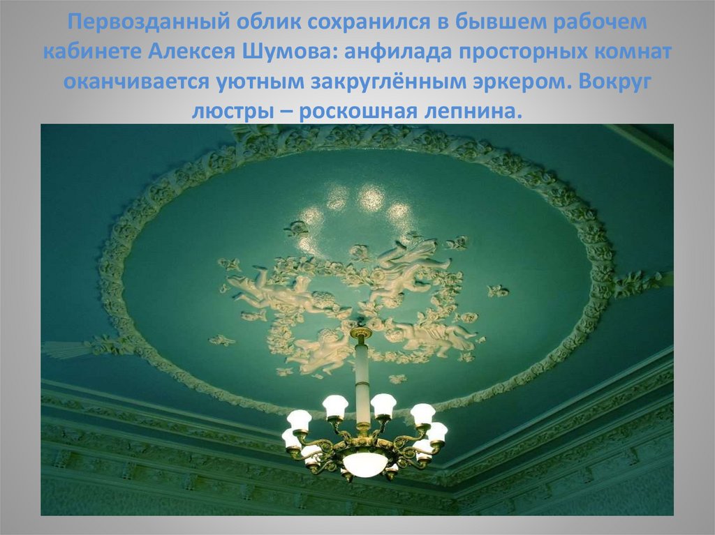 Первозданный облик сохранился в бывшем рабочемкабинете Алексея Шумова: анфилада просторных комнат