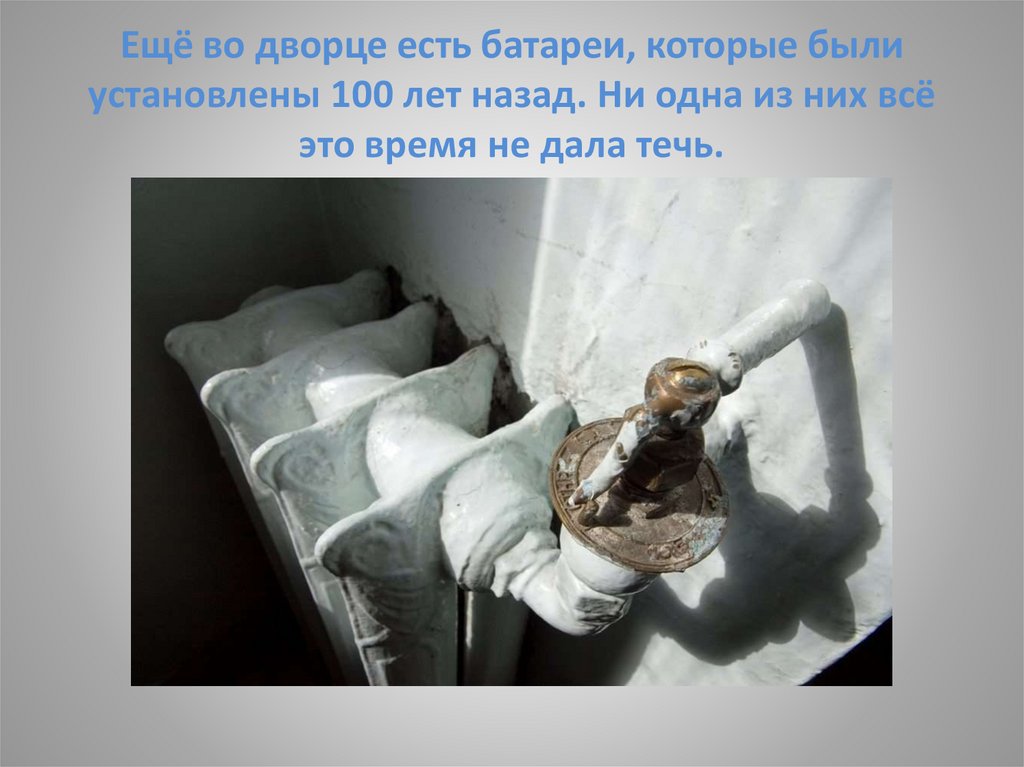 Ещё во дворце есть батареи, которые былиустановлены 100 лет назад. Ни одна из них всё