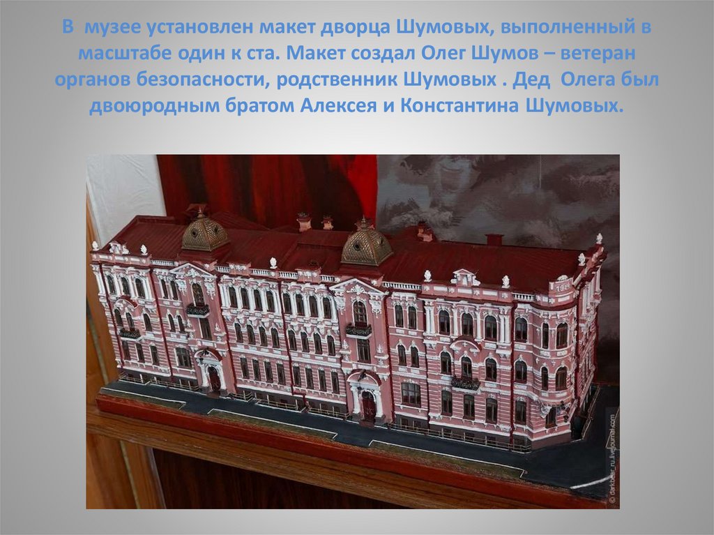 В музее установлен макет дворца Шумовых, выполненный вмасштабе один к ста. Макет создал Олег Шумов – ветеран