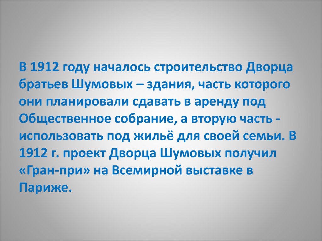 В 1912 году началось строительство Дворцабратьев Шумовых – здания, часть которого