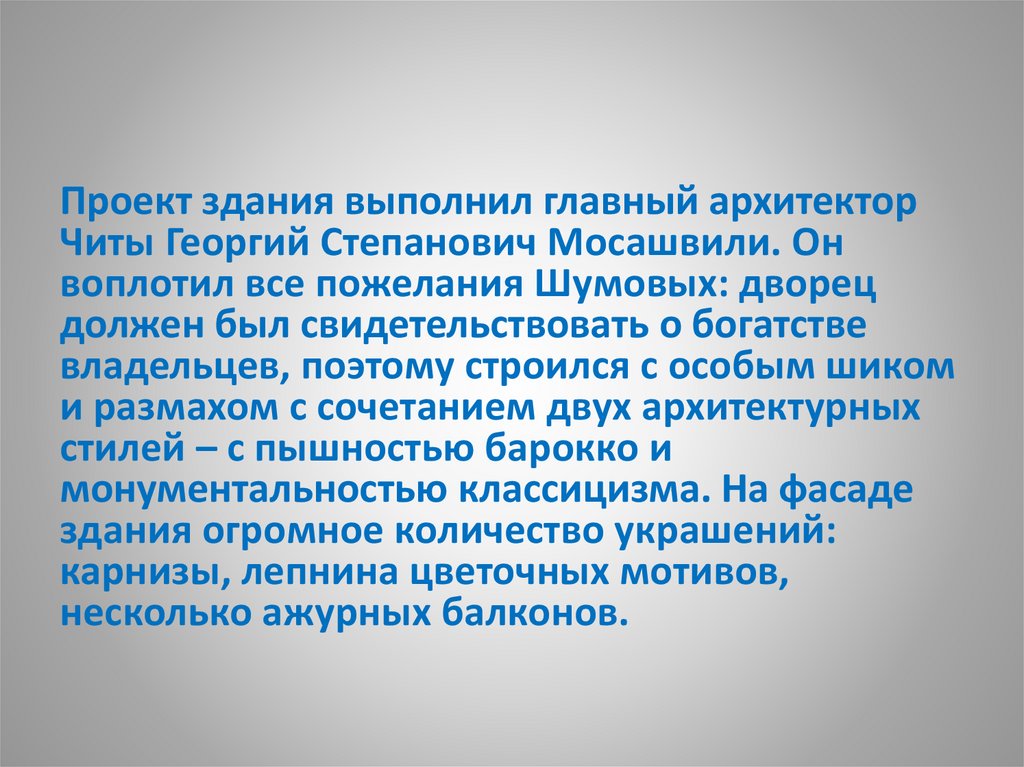 Проект здания выполнил главный архитекторЧиты Георгий Степанович Мосашвили. Он