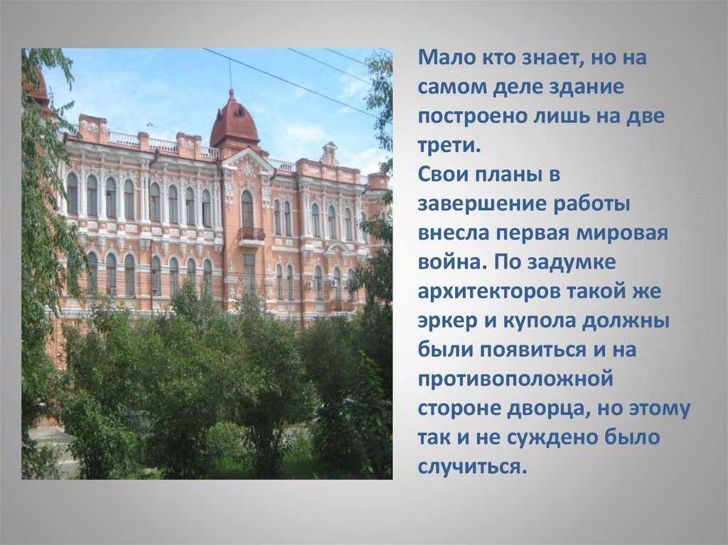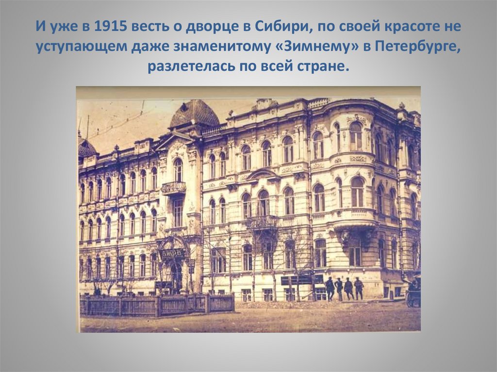 И уже в 1915 весть о дворце в Сибири, по своей красоте неуступающем даже знаменитому «Зимнему» в Петербурге,