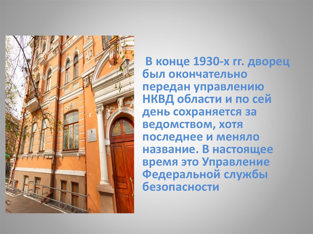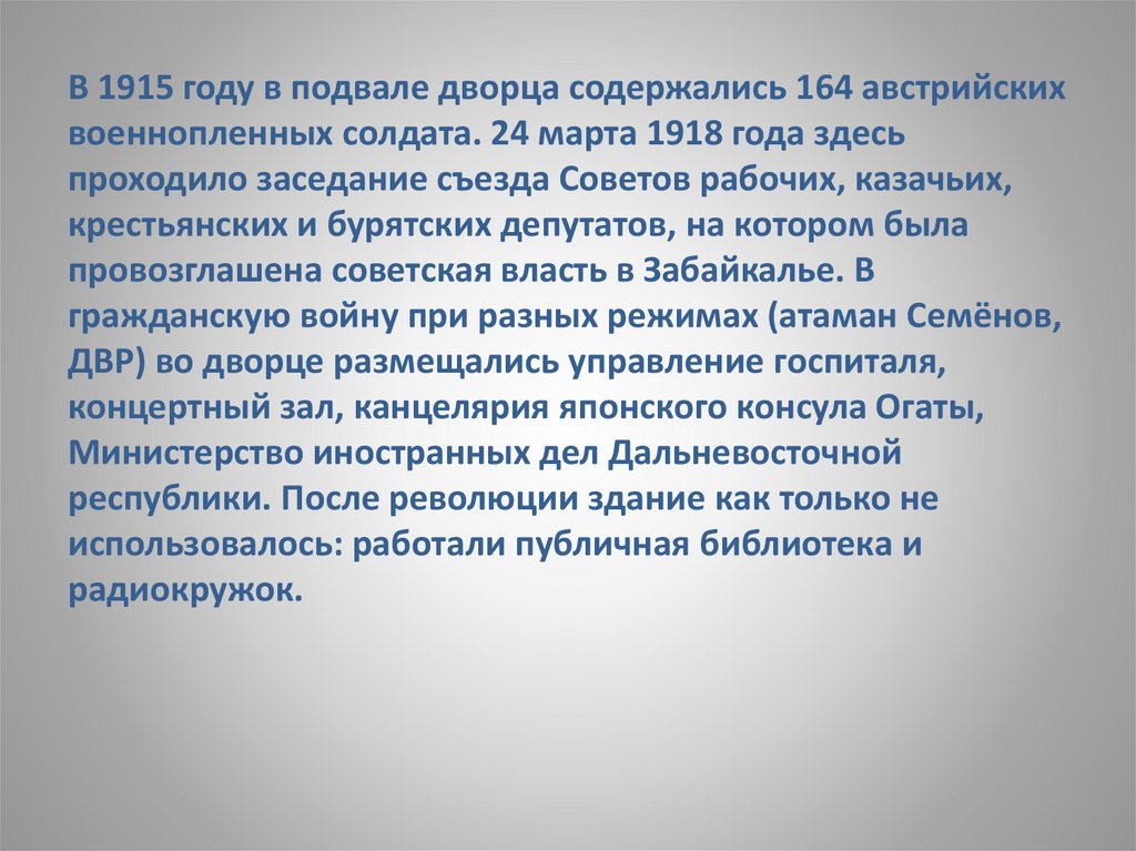 В 1915 году в подвале дворца содержались 164 австрийскихвоеннопленных солдата. 24 марта 1918 года здесь