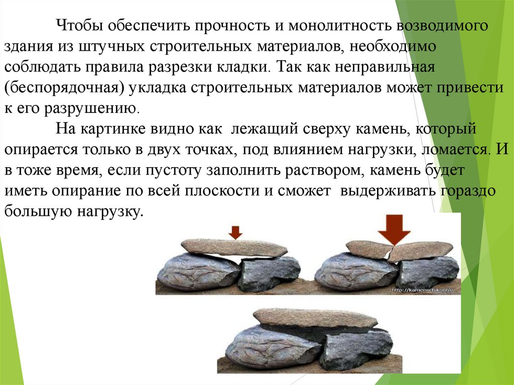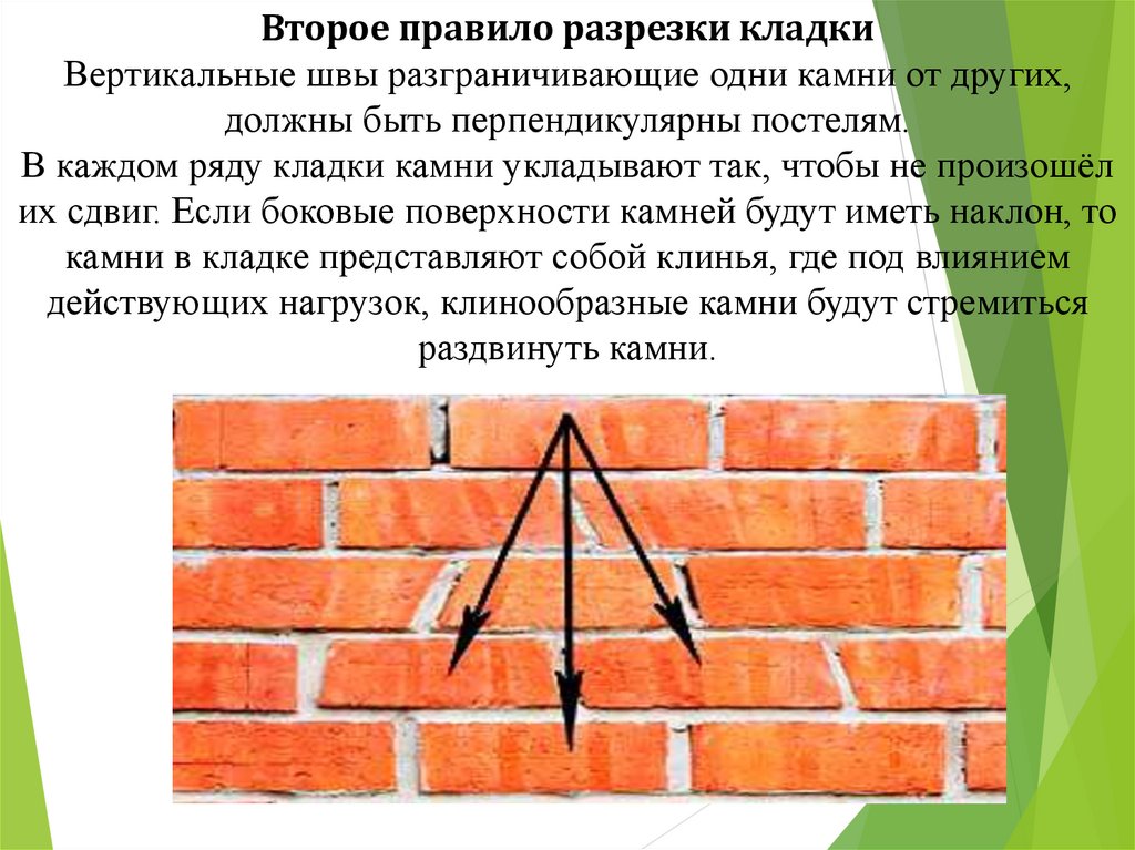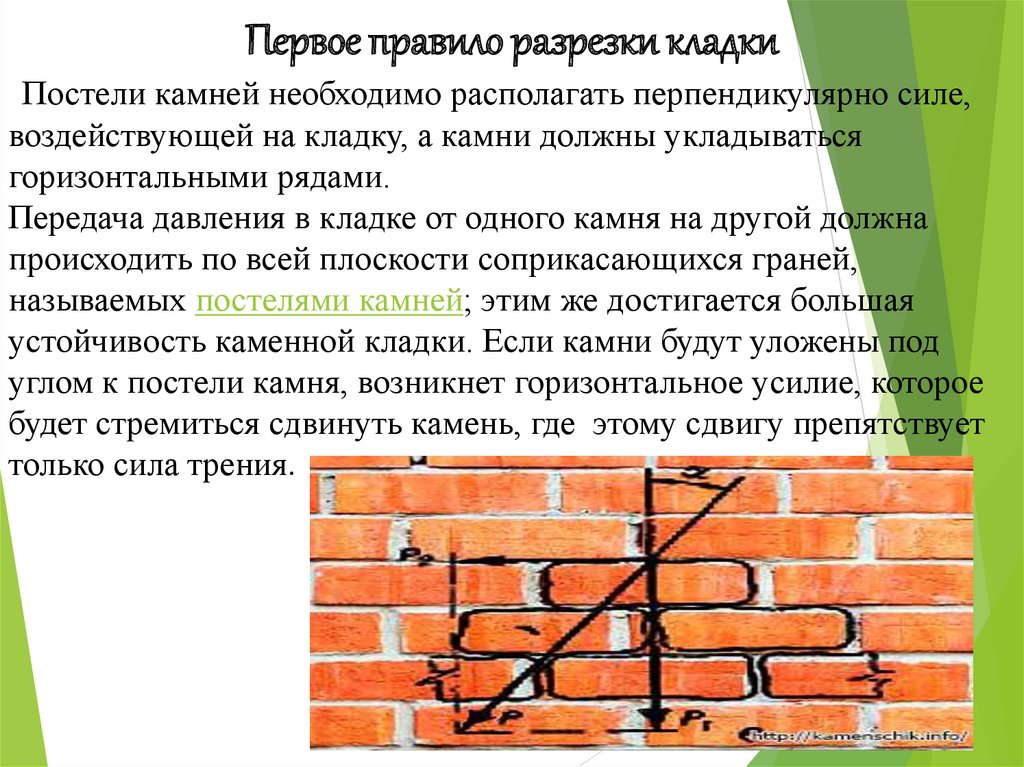Первое правило разрезки кладкиПостели камней необходимо располагать перпендикулярно силе,