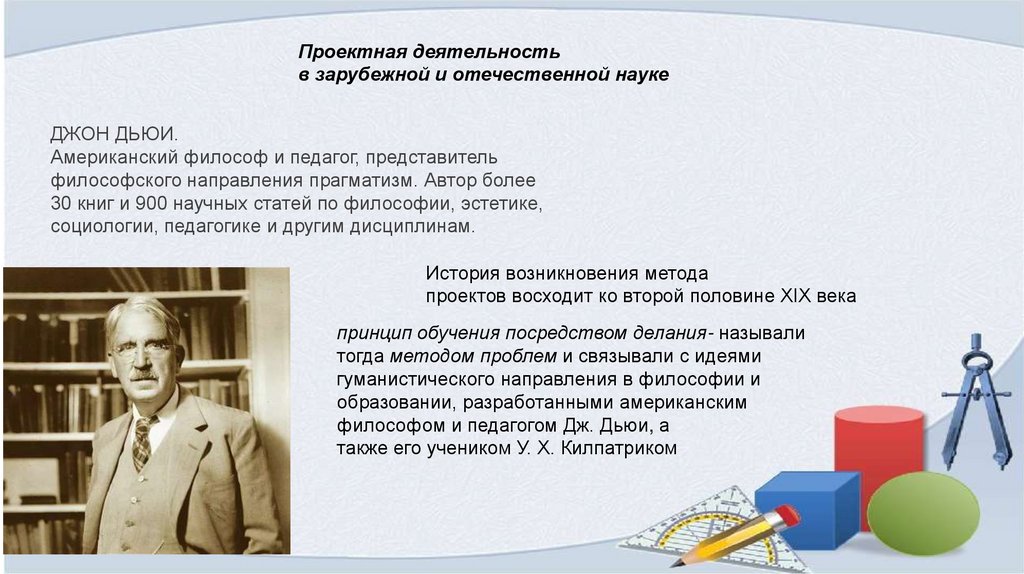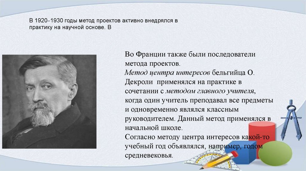 В 1920–1930 годы метод проектов активно внедрялся впрактику на научной основе. В