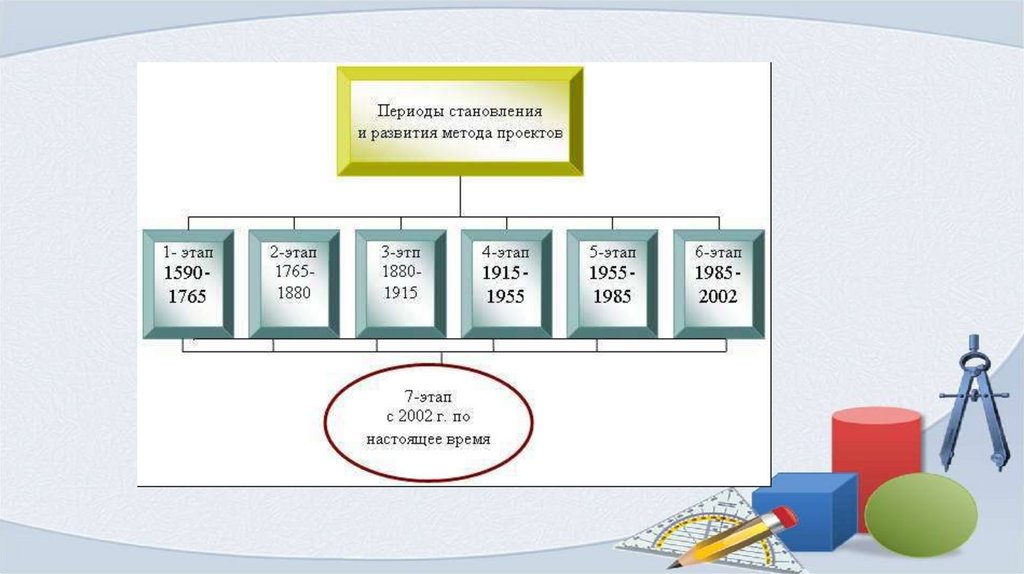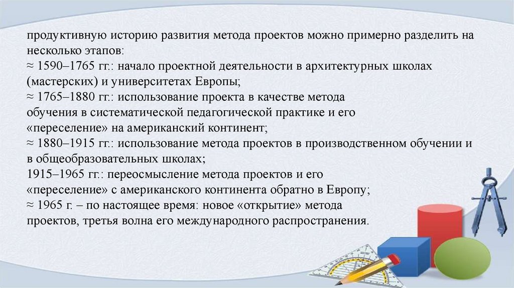 продуктивную историю развития метода проектов можно примерно разделить нанесколько этапов: