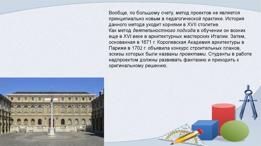 Вообще, по большому счету, метод проектов не являетсяпринципиально новым в педагогической практике. История