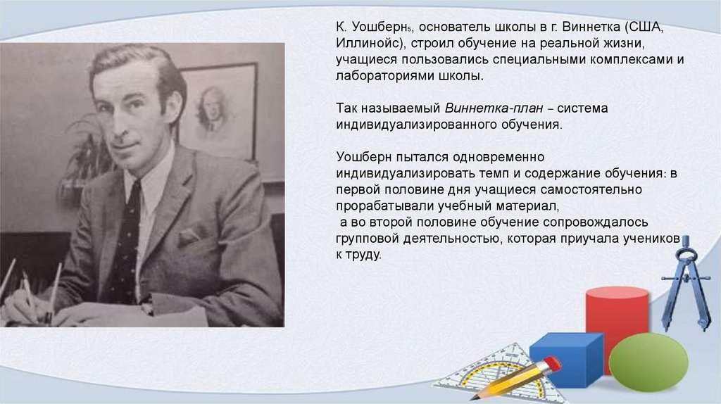 К. Уошберн5, основатель школы в г. Виннетка (США,Иллинойс), строил обучение на реальной жизни,