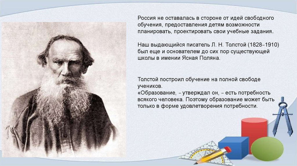 Россия не оставалась в стороне от идей свободногообучения, предоставления детям возможности