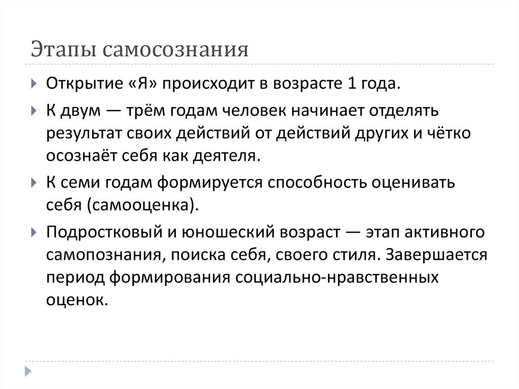 Этапы самосознанияОткрытие «Я» происходит в возрасте 1 года.