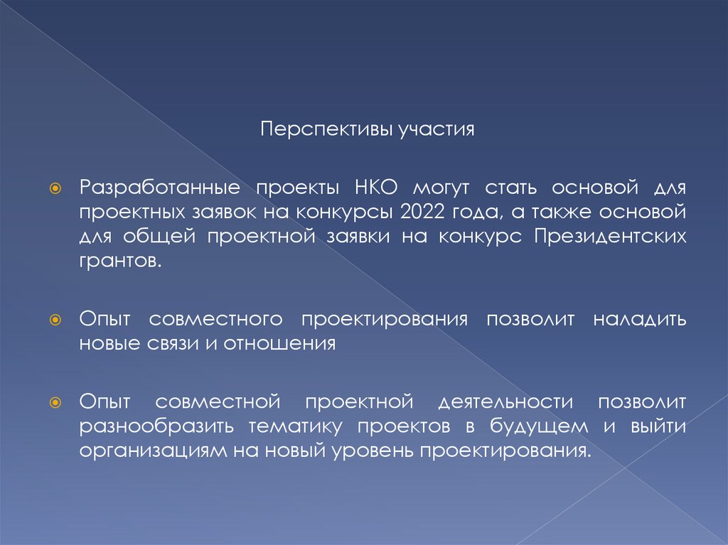 Перспективы участияРазработанные проекты НКО могут стать основой для