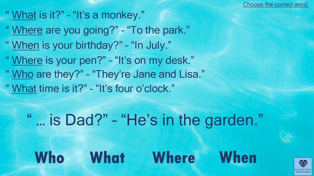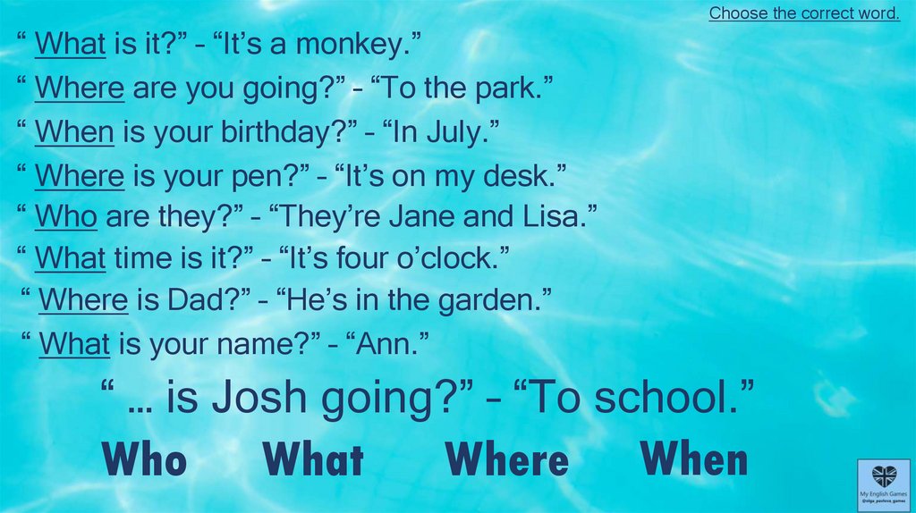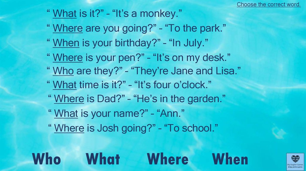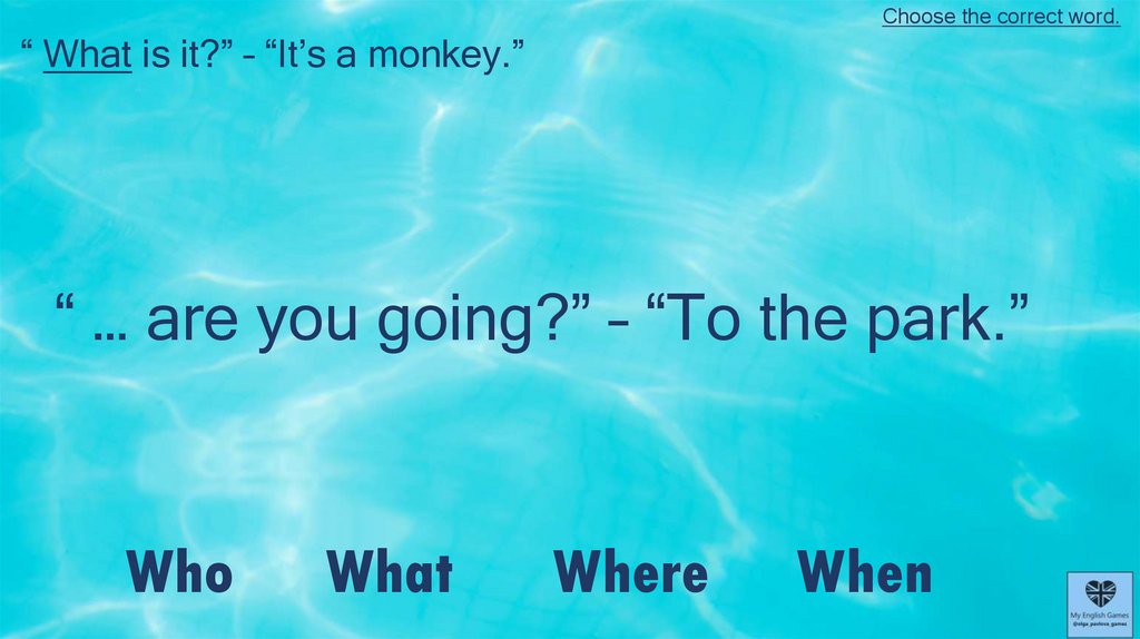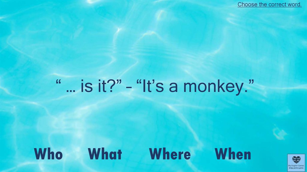 Choose the correct word.“ … is it?” – “It’s a monkey.”
