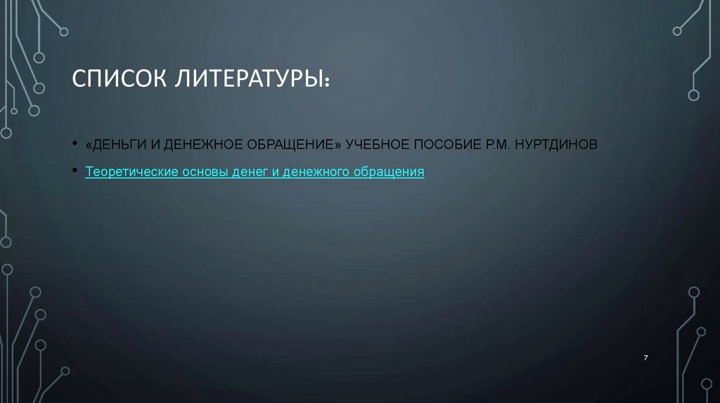 СПИСОК ЛИТЕРАТУРЫ:«ДЕНЬГИ И ДЕНЕЖНОЕ ОБРАЩЕНИЕ» УЧЕБНОЕ ПОСОБИЕ Р.М. НУРТДИНОВ