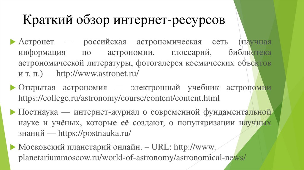 Краткий обзор интернет-ресурсовАстронет — российская астрономическая сеть (научная