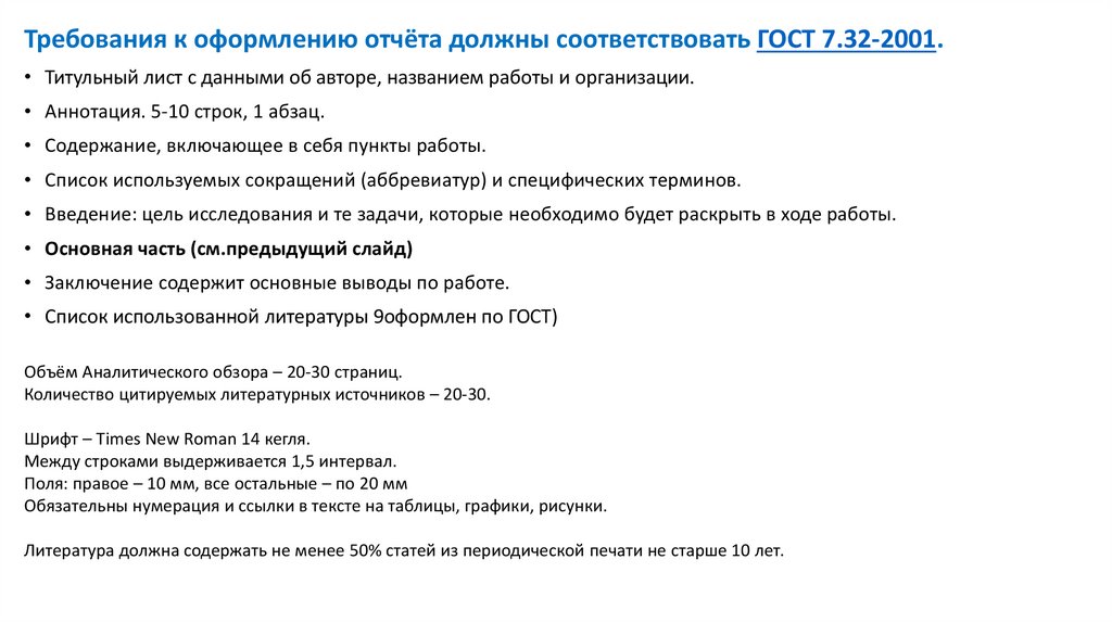 Требования к оформлению отчёта должны соответствовать ГОСТ 7.32-2001.• Титульный лист с данными об авторе, названием работы и организации.