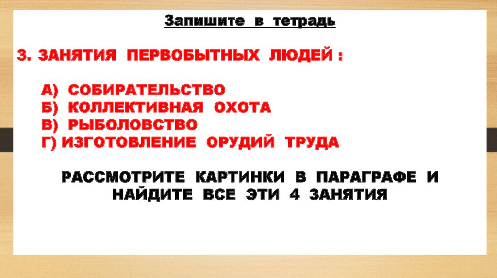 Запишите в тетрадь3. ЗАНЯТИЯ ПЕРВОБЫТНЫХ ЛЮДЕЙ :