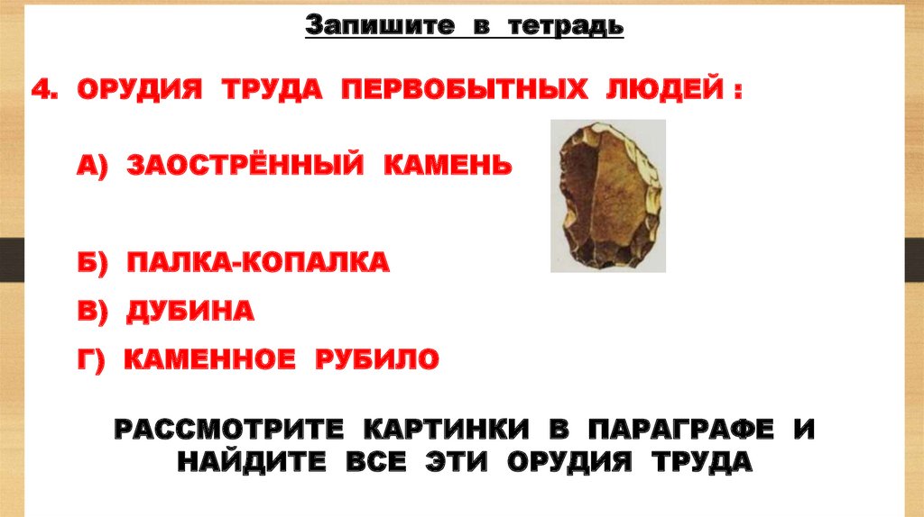 Запишите в тетрадь4. ОРУДИЯ ТРУДА ПЕРВОБЫТНЫХ ЛЮДЕЙ :