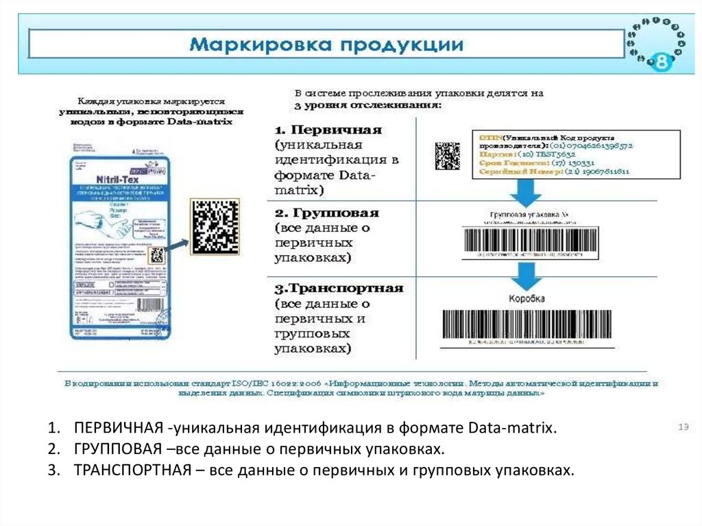 1. ПЕРВИЧНАЯ -уникальная идентификация в формате Data-matrix.2. ГРУППОВАЯ –все данные о первичных упаковках.