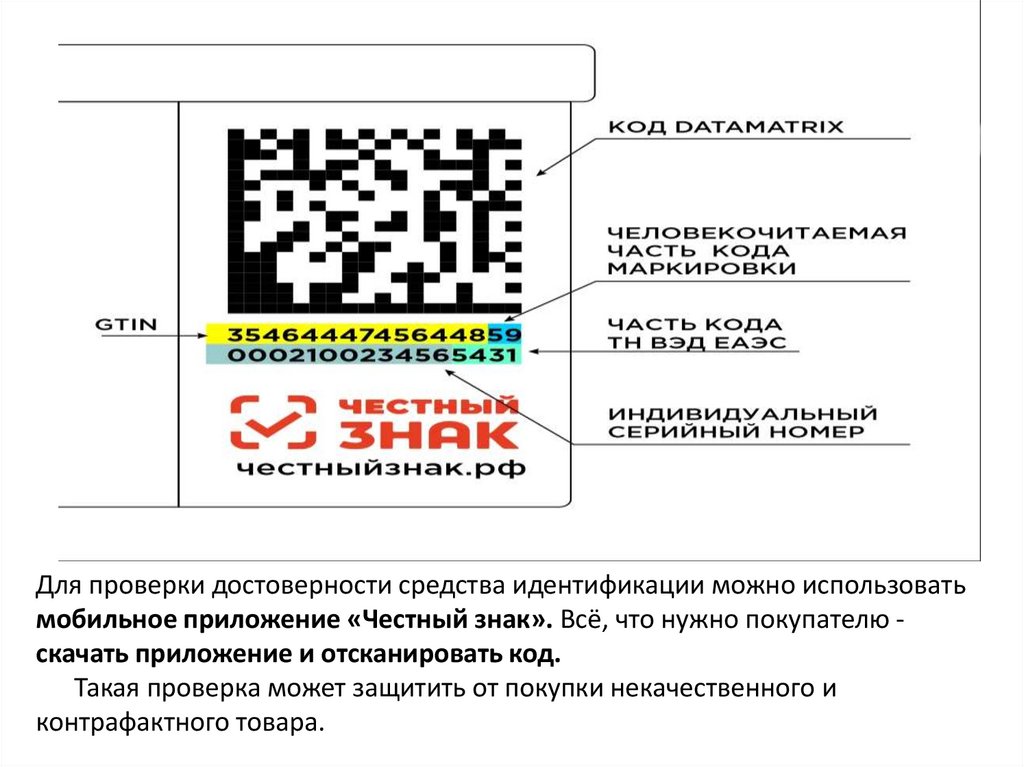 Для проверки достоверности средства идентификации можно использоватьмобильное приложение «Честный знак». Всё, что нужно покупателю скачать приложение и отсканировать код.