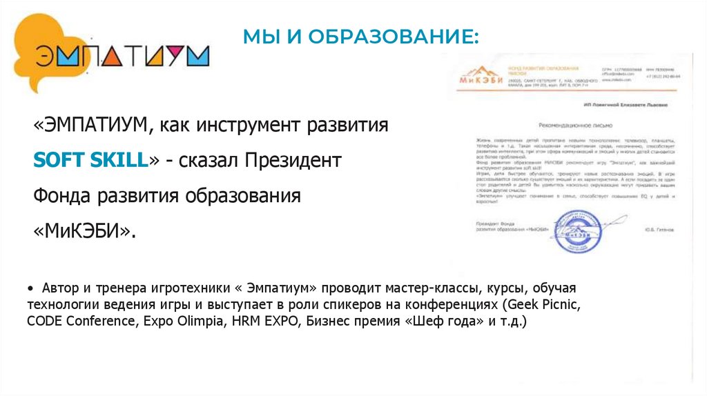 • Автор и тренера игротехники « Эмпатиум» проводит мастер-классы, курсы, обучая