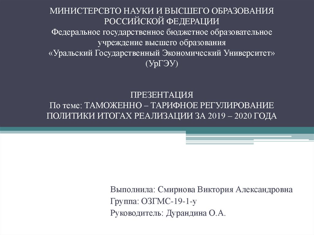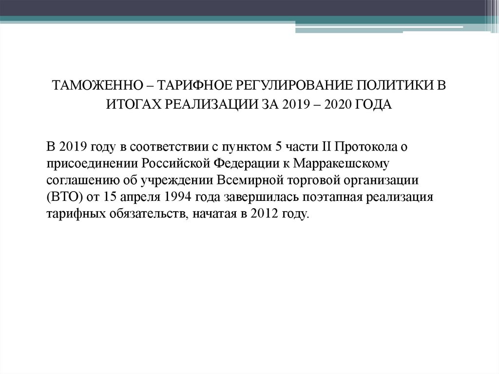 ТАМОЖЕННО – ТАРИФНОЕ РЕГУЛИРОВАНИЕ ПОЛИТИКИ ВИТОГАХ РЕАЛИЗАЦИИ ЗА 2019 – 2020 ГОДА
