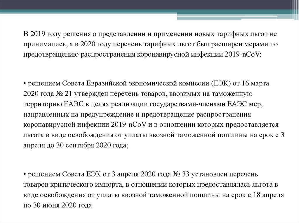 В 2019 году решения о представлении и применении новых тарифных льгот непринимались, а в 2020 году перечень тарифных льгот был расширен мерами по