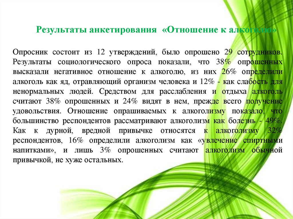 Результаты анкетирования «Отношение к алкоголю»Опросник состоит из 12 утверждений, было опрошено 29 сотрудников.