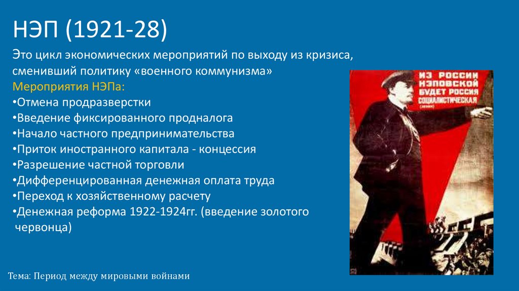 НЭП (1921-28)Это цикл экономических мероприятий по выходу из кризиса,
